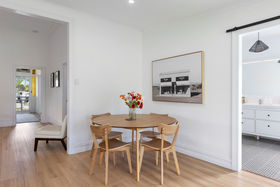 - A spacious dining and living area with a modern Jetmaster wood fireplace.