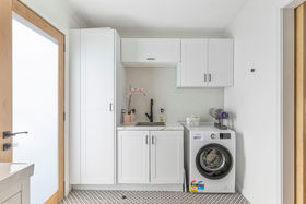 A spacious, combined bathroom & laundry with stunning Italian floor tiles, step-less shower, and plenty of storage space.